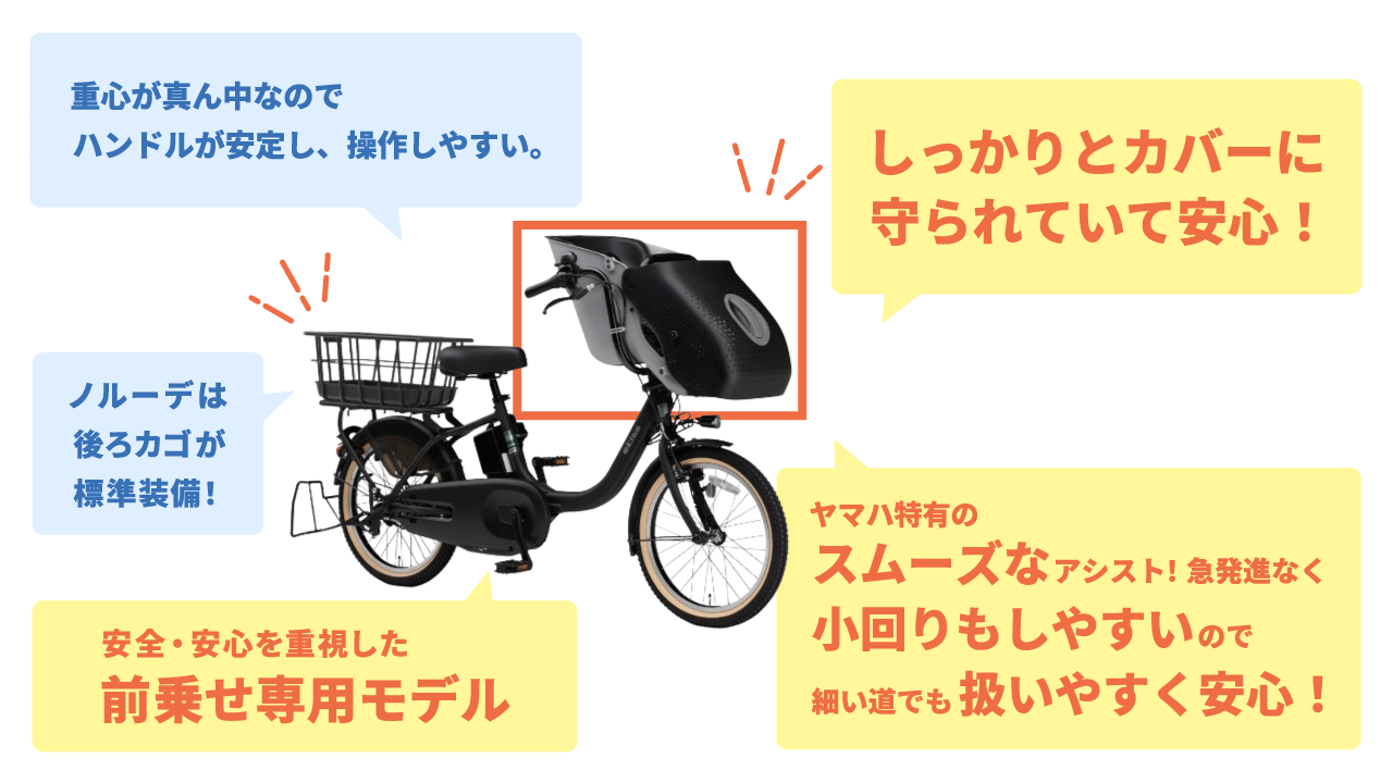 1歳になったばかりで体も小さく言葉も話し始めたばかり、パパママも自転車に慣れていないという場合は、子供の様子が分かる「前乗せ専用モデル」が安心です。