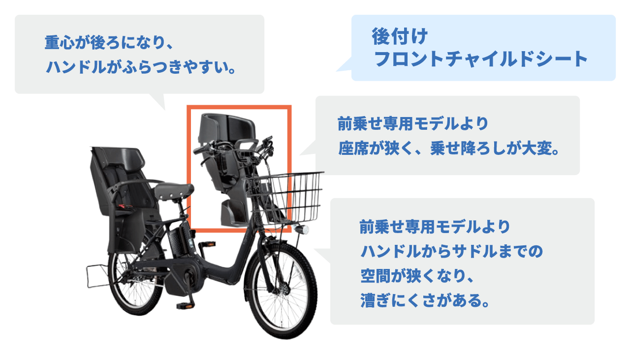 「前乗せ専用モデル」と「後付のフロントチャイルドシート」と「後ろ乗せ」